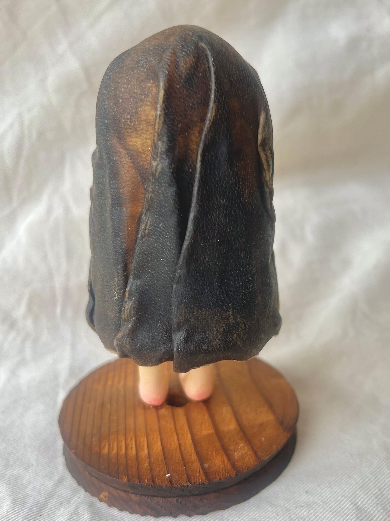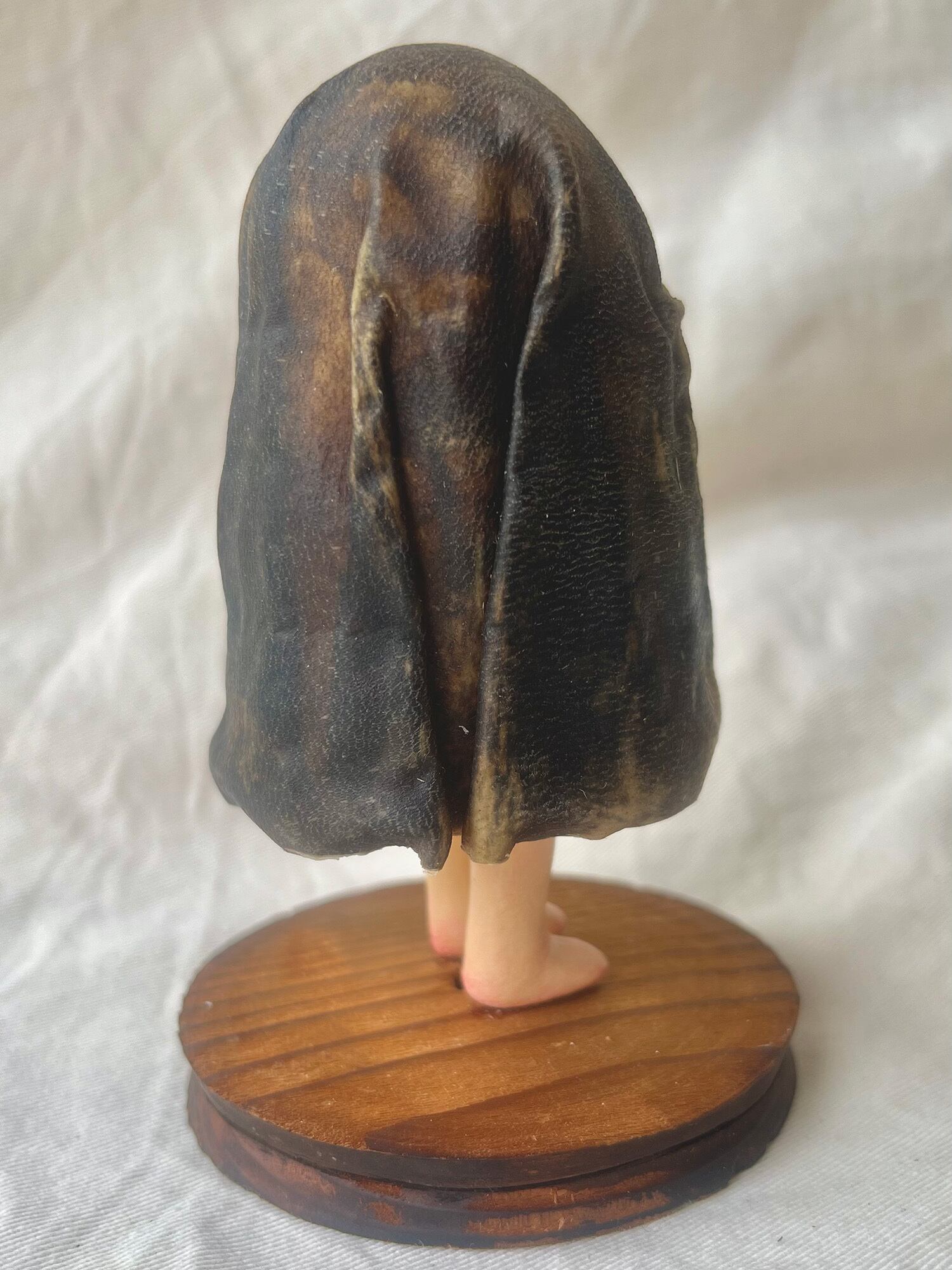 佐藤の制作したオバケにimocoさんがなめした革で包んでいます。